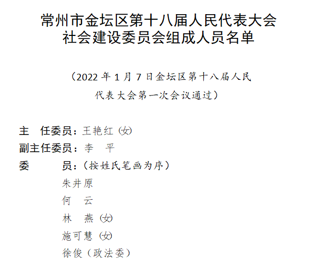 常州市金坛区第十八届人民代表大会社会建设委员会组成人员名单
